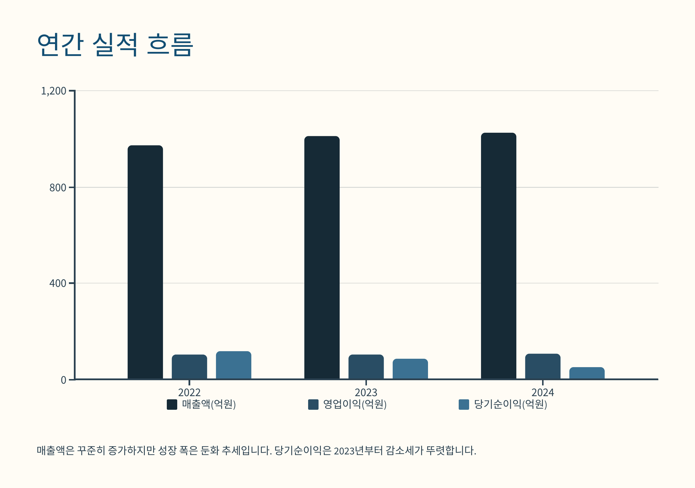 매출액은 꾸준히 증가하는 추세를 보이고 있으나, 그 성장 폭은 다소 둔화된 모습입니다.