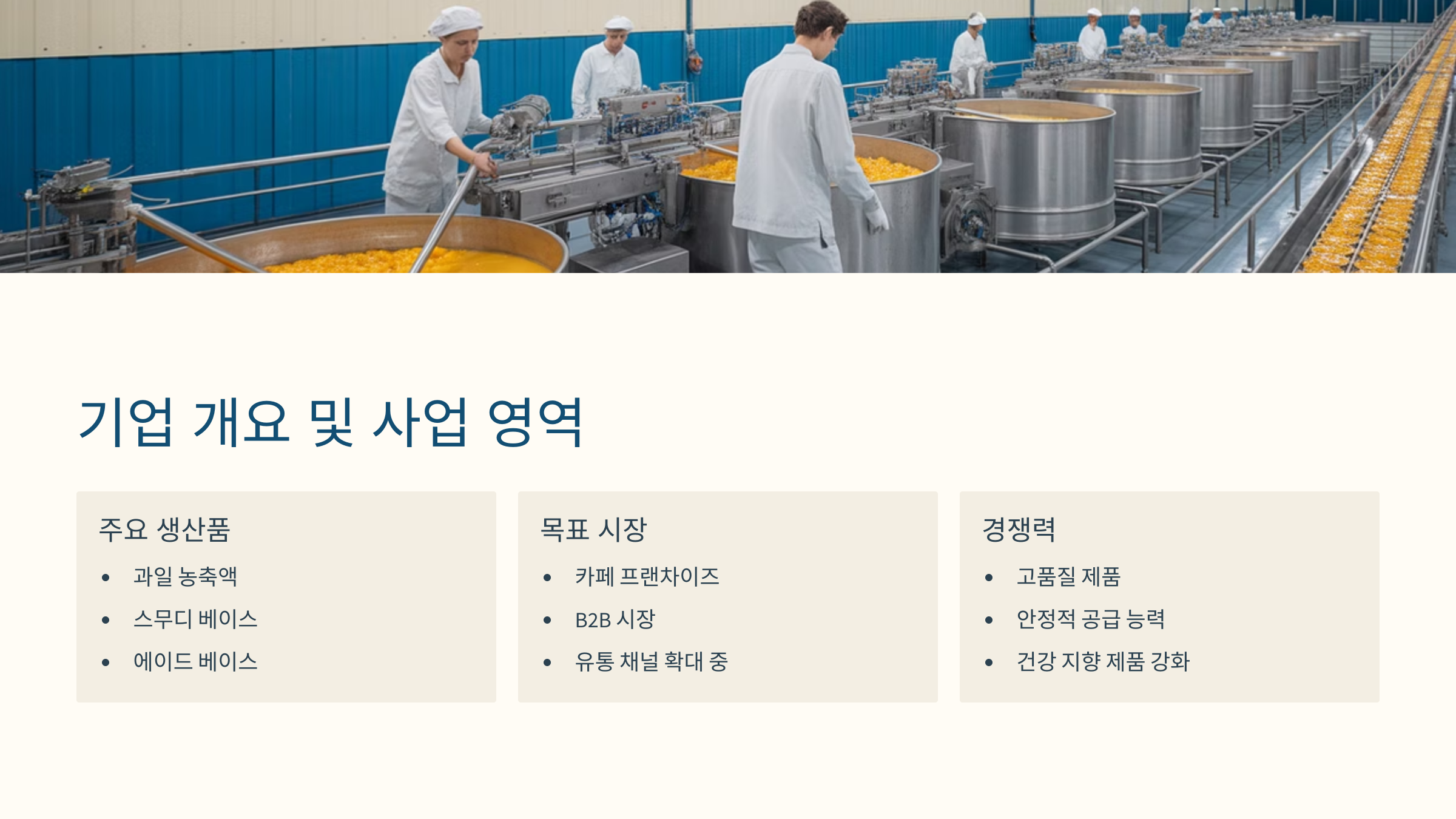흥국에프엔비는 과일 농축액, 스무디, 에이드 베이스 등 다양한 음료 원재료를 전문적으로 생산 및 유통하는 기업입니다.